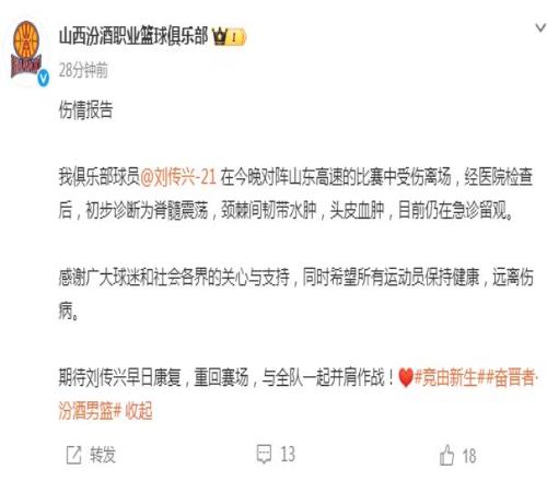 山西男籃官宣劉傳興傷情:脊髓震蕩頭皮血腫仍在急診留院觀察