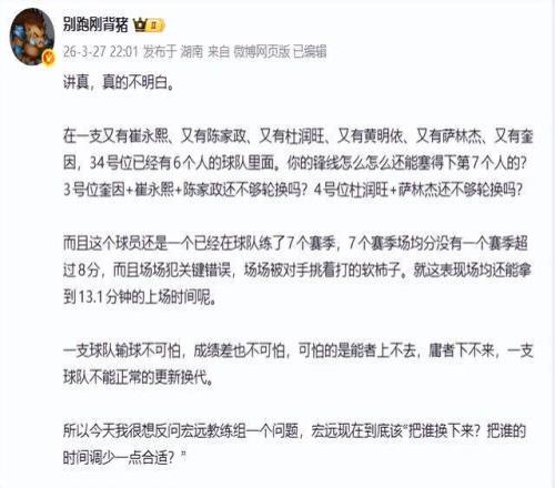 顯然,廣東男籃的輪換困境,早已不是輸球能簡單解釋的系統(tǒng)性問題。當(dāng)一支球隊在3號位堆砌崔永熙、陳家政、奎因,4號位配置杜潤旺、薩林杰,已擁有五名具備實戰(zhàn)能力的鋒線球員時,仍讓一名七年未突破場均8分、關(guān)鍵回合屢屢失位、防守端被對手持續(xù)針對的球員——張皓嘉,穩(wěn)定占據(jù)13.1分鐘上場時間——這已不是戰(zhàn)術(shù)選擇,而是管理失序。