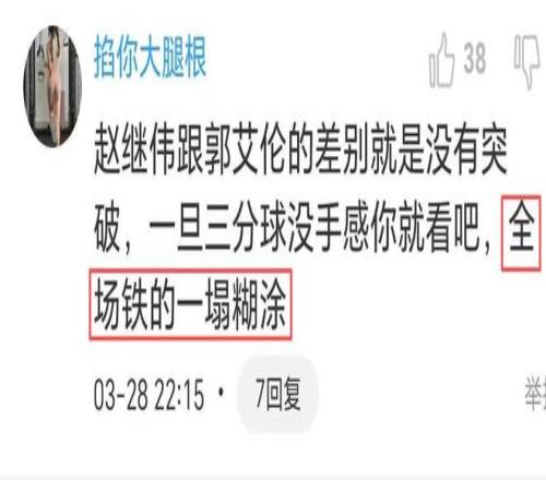 上場與吉林隊的比賽,趙繼偉更是瘋狂浪投,14次出手僅打中一球,29分鐘僅得3分,賽后遭到烏戈暗批:命中率太低。最近兩場趙繼偉一共21次出手,只打中2球,命中率不夠一成,這樣的表現(xiàn)與趙繼偉的名氣和身價毫不相配,球迷說,趙繼偉跟郭艾倫的差別就是沒有突破,一旦三分球沒手感你就看吧,全場鐵的一塌糊涂。