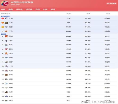 CBA最新排名!第1支季后賽球隊出爐,4隊20勝11負,遼寧坐11望8