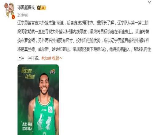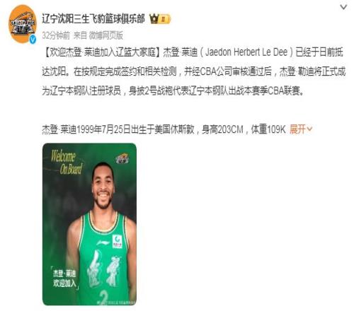 如今遼寧男籃官宣簽約新大外援杰登·萊迪:“【歡迎杰登·萊迪加入遼籃大家庭】杰登·萊迪已經(jīng)于日前抵達沈陽,在按規(guī)定完成簽約和相關檢測,并經(jīng)CBA公司審核通過后,杰登·勒迪將正式成為遼寧本鋼隊注冊球員,身披2號戰(zhàn)袍代表遼寧本鋼隊出戰(zhàn)本賽季CBA聯(lián)賽?!?/p>