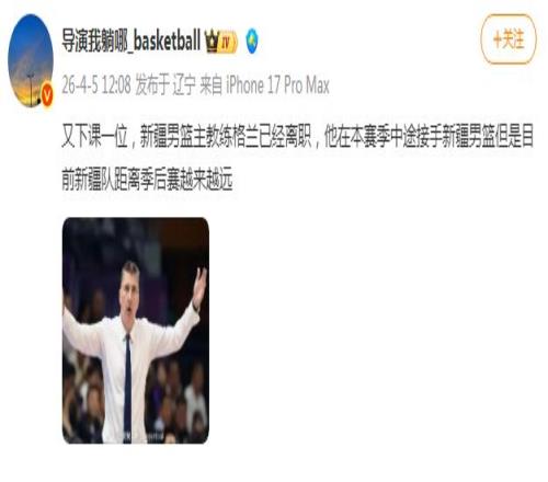北京時間4月5日,在賽季初劉煒因為戰(zhàn)績不佳離隊后,如今根據(jù)媒體人導演我躺哪報道,新疆男籃新任主教練格蘭也已經(jīng)離職。新疆男籃賽季未打完已經(jīng)兩人主帥離任,而球隊只有倒數(shù)第四戰(zhàn)績距離季后賽越來越遠。