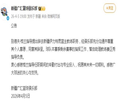 北京時間4月5日,新疆男籃官方發(fā)布公告,正式宣布主教練格蘭提出辭去新疆男籃主教練職務(wù),經(jīng)俱樂部充分溝通并尊重其個人意愿,同意其辭呈。至于剩余的賽事,將暫由助理教練姜正秀指導(dǎo)負(fù)責(zé)。