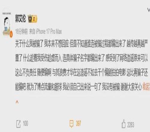 不過事情迎來了終極反轉(zhuǎn),郭艾倫發(fā)博明確表示自己沒有被騙,都是不負(fù)責(zé)任胡編亂造的假新聞。