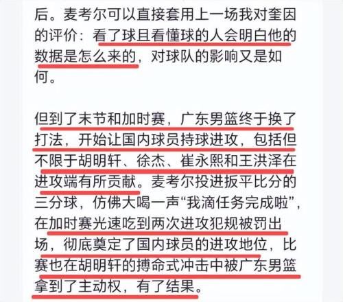 末節(jié)是依靠國內(nèi)球員贏得了比賽。麥穗豐說,“但到了末節(jié)和加時賽,廣東男籃終于換了打法,開始讓國內(nèi)球員持球進攻,包括但不限于胡明軒、徐杰、崔永熙和王洪澤在進攻端有所貢獻”,麥穗豐指出:麥考爾在加時賽光速吃到兩次進攻犯規(guī)被罰出場,徹底奠定了國內(nèi)球員的進攻地位,比賽也在胡明軒的搏命式?jīng)_擊中被廣東男籃拿到了主動權(quán),有了結(jié)果。