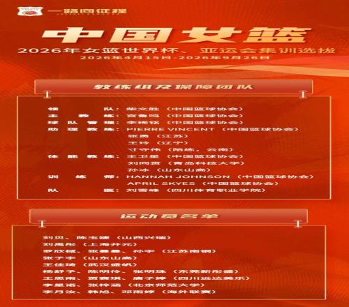 4月13日,中國(guó)籃球協(xié)會(huì)發(fā)布公告稱(chēng),為備戰(zhàn)2026年國(guó)際籃聯(lián)女籃世界杯及愛(ài)知·名古屋亞運(yùn)會(huì),將于2026年4月15日起在北京體育大學(xué)組織國(guó)家女籃集訓(xùn)選拔工作。結(jié)合2025-26賽季W(wǎng)CBA聯(lián)賽推進(jìn)情況,國(guó)家女籃教練組將依據(jù)隊(duì)員在聯(lián)賽中的競(jìng)技狀態(tài)、隊(duì)伍位置需要及集訓(xùn)表現(xiàn),對(duì)集訓(xùn)人員進(jìn)行動(dòng)態(tài)調(diào)整。隊(duì)伍計(jì)劃于4月至6月在北京分批次開(kāi)展集訓(xùn),期間將在國(guó)內(nèi)參與國(guó)際熱身賽,隨后分別赴澳大利亞和歐洲進(jìn)行熱身賽,熱身賽后前往德國(guó)柏林參加女籃世界杯。世界杯結(jié)束后,隊(duì)伍將出發(fā)參加2026年愛(ài)知·名古屋亞運(yùn)會(huì)。