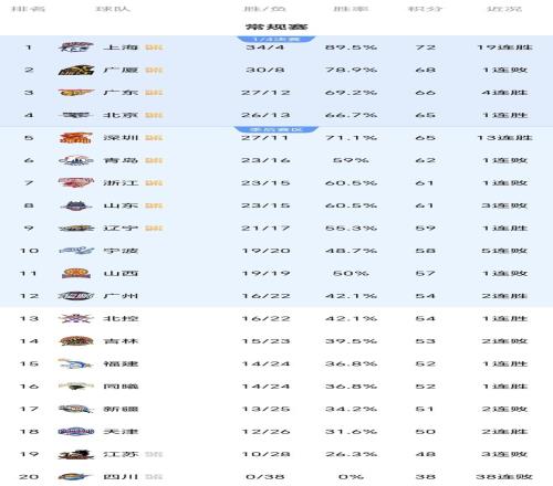 由于常規(guī)賽前四名直通季后賽八強,無需打12進8的附加賽階段,所以競爭也是非常激烈,目前上海隊提前鎖定常規(guī)賽冠軍,廣廈隊也基本鎖定第二,第三、第四的懸念很大,主要在深圳隊、廣東隊、北京隊之間產(chǎn)生。