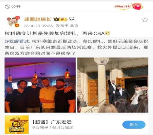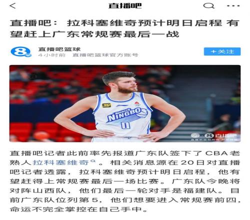 著名籃球記者趙探長確認(rèn)了此事,表示“拉科確實計劃是先參加完婚禮,再來CBA”。第一時間報道拉科加盟廣東的媒體直播吧則透露,拉科塞維奇預(yù)計明日啟程,他將有望趕得上常規(guī)賽最后一場比賽!