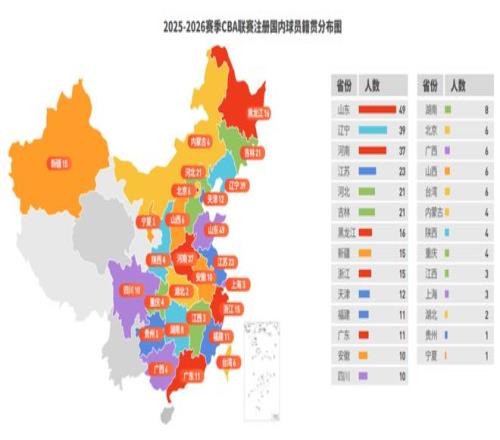 CBA公司公布了2025-26賽季CBA注冊國內(nèi)球員籍貫分布情況。山東超越了去年第一的遼寧位居榜首,遼寧排名第二,河南排名第三,江蘇第四,河北第五。