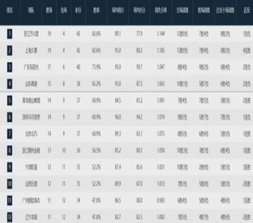 本賽季至今,廣東隊17勝6負(fù)聯(lián)盟第三,廣廈隊和上海隊分列前二,山東隊第四,青島隊第五,深圳隊第六,北京隊第七,浙江隊第八,寧波隊第九,山西隊第十,廣州隊第11,遼寧隊第12。