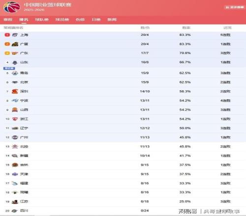 CBA最新排名!上海反超廣廈登榜首,山東第4北京升第6,遼寧第11