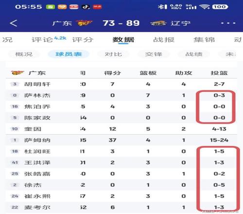 實話實說,廣東隊這場比賽,打得是要多難看,有多難看。3個首發(fā)球員,薩林杰3投0中,焦泊喬0投籃,陳家政0投籃,3人合砍4分,運動戰(zhàn)1分沒得;再看下替補球員,杜潤旺5中1,王洪澤3中1,張皓嘉2中0,徐杰5中0,崔永熙5中1,麥考爾3中1。6名替補合計23投4中,這球還打個鬼喲……