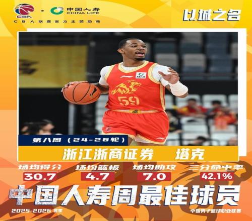 CBA官方社交媒體寫道:浙江浙商證券球員塔克本周出戰(zhàn)3場,率隊取得其中2場勝利,他場均出場32分鐘,可以得到30.7分、4.7籃板、7助攻,本周塔克以42.1%的三分命中率場均命中2.7記三分球。
