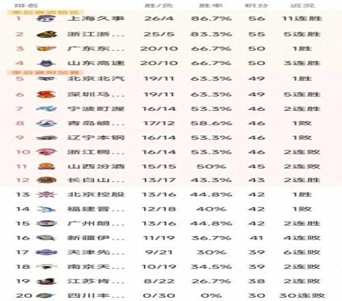 CBA最新積分榜:上海11連勝排第1,廣東第3,北京第5,遼寧第9