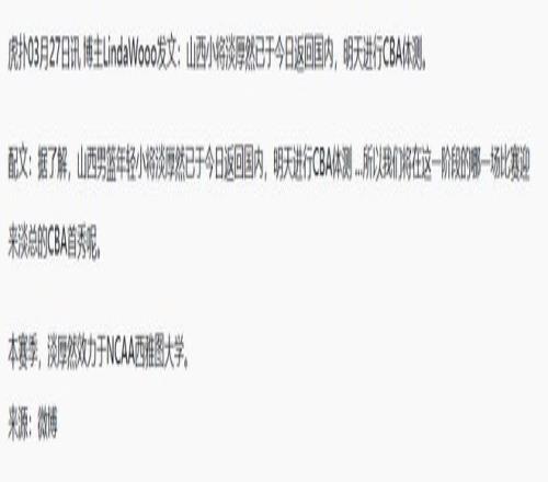 2026年3月27日山西拿下山東,賽后還迎來(lái)了一個(gè)利好消息,那就是淡厚然居然回國(guó)了。因?yàn)楦鶕?jù)目前曝光的消息:淡厚然已于今日返回國(guó)內(nèi),明天進(jìn)行CBA體測(cè)。如果明天過體測(cè)的話,可能接下來(lái)也快迎來(lái)首秀了?