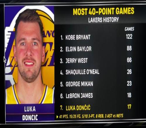 第7、據(jù)統(tǒng)計(jì),這是東契奇湖人生涯第17次單場(chǎng)40+,湖人隊(duì)史第七多,差一場(chǎng)追平勒布朗詹姆斯。