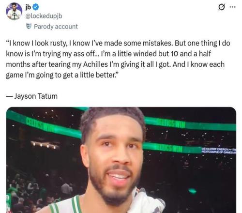 賽后塔圖姆也直言感覺身體有些生銹,在跟腱撕裂10個半月后,雖然有點喘不上來氣,但自己已經(jīng)盡了全力,并且能夠感覺到每一場比賽都在變得更好。