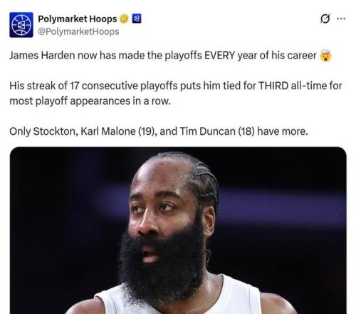 值得一提的是,最后關(guān)頭,哈登單打命中幫助騎士收割了比賽。同時(shí),哈登個(gè)人也鎖定季后賽,個(gè)人生涯17個(gè)賽季從未缺席季后賽。