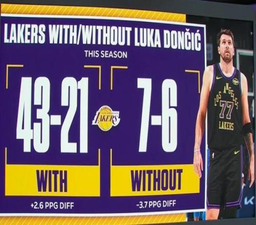 本賽季東契奇出戰(zhàn)湖人戰(zhàn)績(jī)43勝21負(fù),東契奇缺戰(zhàn)時(shí),湖人戰(zhàn)績(jī)僅為7勝6負(fù)。