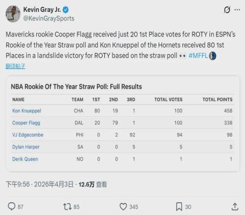 ESPN邀請100位體育媒體人,模擬最佳新秀投票。克尼佩爾得到80張第一選票,弗拉格得到20張第一選票!談到最佳新秀之爭,今天賽后弗拉格表示:“希望這場51分有所幫助,但我不會為此擔(dān)心,我只專注于每晚讓自己變得更好?!?/p>
