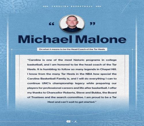 官方:邁克爾馬龍正式成為北卡羅萊納男籃主教練