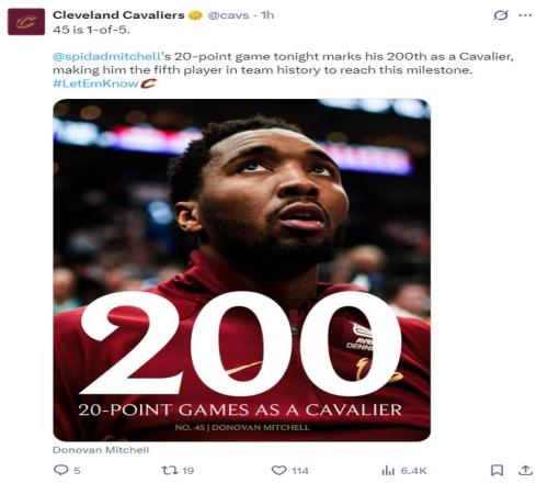 騎士官方寫道:米切爾在騎士生涯完成第200場(chǎng)20+排在隊(duì)史第五位,米切爾又迎來(lái)一項(xiàng)里程碑,他還用自己在關(guān)鍵時(shí)刻的能力帶隊(duì)取勝。