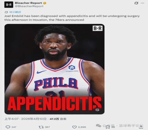 北京時(shí)間4月10日,76人客場vs火箭。賽前76人官方宣布:恩比德已經(jīng)在休斯頓接受闌尾炎手術(shù),常規(guī)賽報(bào)銷。醫(yī)學(xué)專家Jeff Stotts透露,闌尾切除術(shù)在NBA相對比較罕見,平均缺陣時(shí)間23天。這樣一來,恩比德5月份才能復(fù)出。