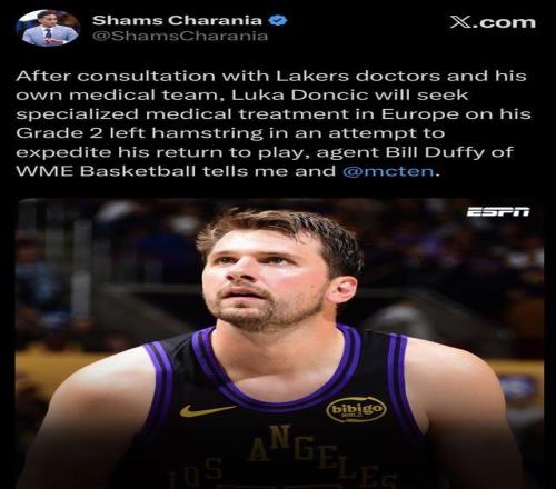 湖人輸給獨行俠的當晚,東契奇做出了一個讓球迷既感動又揪心的決定。他的經紀人Bill Duffy告訴Shams,這位25歲的核心將飛往歐洲接受左腿筋二級拉傷的專項治療,試圖加速復出。