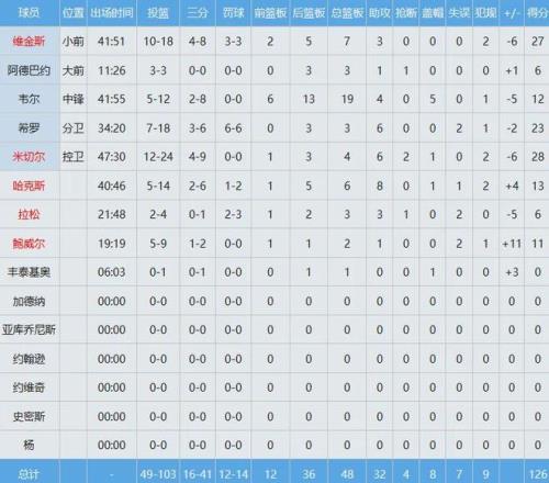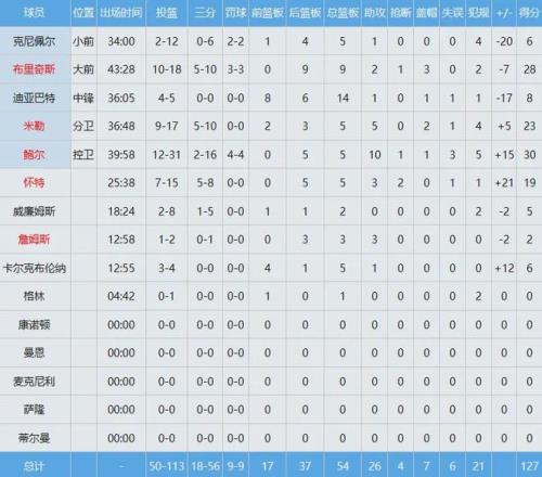 三球瘋狂出手31次中12球,換回30分5板10助;超級新秀克尼佩爾未能打出應(yīng)有水平,投籃12中2只得到6分5板1助,正負(fù)值-20全場最低。