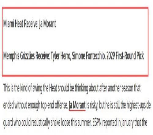 灰熊本賽季徹底擺爛,25勝57負(fù)排名西部第13,球隊(duì)先后送走貝恩、賈倫·杰克遜二世開啟重建,莫蘭特成了隊(duì)中僅剩的“大魚”。據(jù)ESPN一月份報(bào)道,灰熊早已開始評(píng)估莫蘭特的交易報(bào)價(jià),如今重建進(jìn)入關(guān)鍵期,這位天賦異稟卻在場(chǎng)外麻煩不斷,被球隊(duì)清洗已是必然。FW給出的交易方案如下:熱火送出泰勒·希羅、西蒙·豐特基奧以及2029年首輪選秀權(quán),從灰熊換來賈·莫蘭特。這筆交易,對(duì)雙方來說都是各取所需。