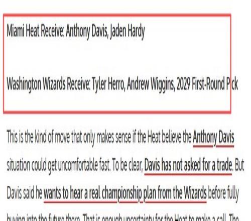 濃眉的名字出現(xiàn)在熱火的交易名單中,或許令人有些意外,但仔細(xì)想想,卻又在情理之中。自從被獨(dú)行俠交易到奇才后,濃眉的處境就十分尷尬,奇才本賽季17勝65負(fù)排名聯(lián)盟墊底,重建遙遙無期,而濃眉曾明確表示,希望聽到奇才的爭(zhēng)冠計(jì)劃,否則不會(huì)排除提出交易申請(qǐng),這就是熱火的機(jī)會(huì)。FW給出的交易方案如下:熱火送出泰勒·希羅、安德魯·威金斯以及2029年首輪選秀權(quán),得到濃眉和賈登·哈迪。