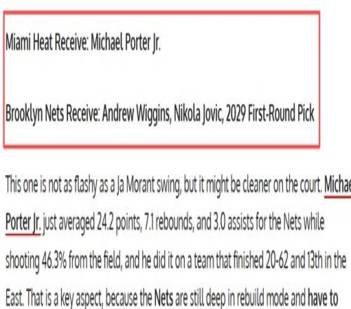如果說莫蘭特是“高風(fēng)險(xiǎn)高回報(bào)”,那邁克爾·波特二世就是熱火更穩(wěn)妥的選擇。籃網(wǎng)本賽季20勝62負(fù)排名東區(qū)倒數(shù),重建之旅遙遙無期,雖然波特公開表示想留在籃網(wǎng),但管理層對(duì)他的球隊(duì)定位并不明確——畢竟,籃網(wǎng)需要的是更年輕、更具培養(yǎng)價(jià)值的年輕人,而不是處于合同末年的得分手。FW給出的交易方案如下:熱火送出安德魯·威金斯、尼古拉·約維奇以及2029年首輪選秀權(quán),換來小波特。