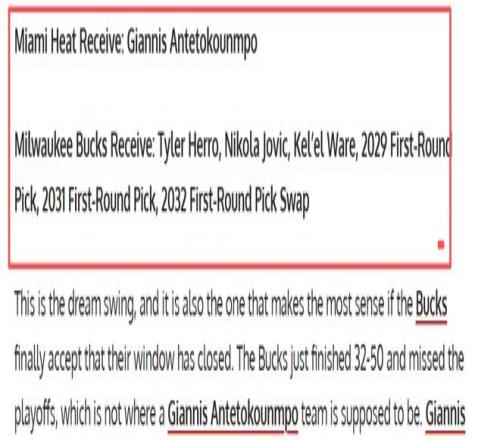 據(jù)ESPN報(bào)道,早在今年交易截止日前,熱火就和雄鹿探討過字母哥的交易,當(dāng)時(shí)的談判圍繞希羅、凱爾·韋爾以及多個(gè)首輪選秀權(quán)展開,如今雄鹿未能進(jìn)入季后賽,字母哥和球隊(duì)因?yàn)槌鰣?chǎng)的問題徹底鬧掰,這無疑給了熱火再次出擊的機(jī)會(huì)。FW提供的終極交易方案如下:熱火送出泰勒·希羅、尼古拉·約維奇、凱爾·韋爾,以及2029年、2031年兩個(gè)首輪選秀權(quán)和2032年首輪選秀權(quán)交換權(quán),從雄鹿換來字母哥。