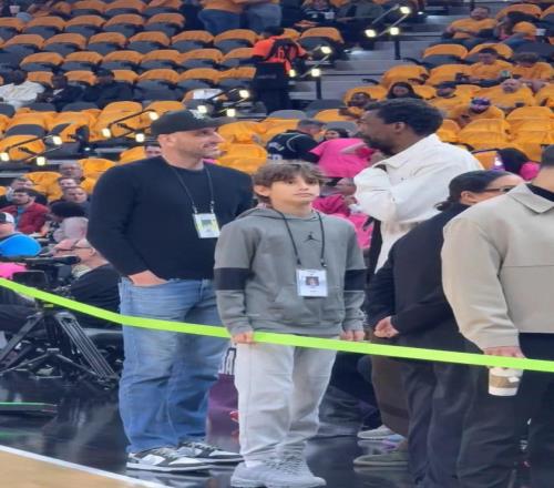 文班亞馬的父親費利克斯在場邊和馬刺名宿吉諾比利聊天。