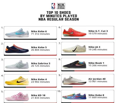 賽季結(jié)算又又又來了,球鞋媒體kixstats統(tǒng)計了本賽季最受歡迎的球鞋TOP10,上腳總時間最多的十雙鞋有九雙耐克一雙Jordan,甚至科比鞋就占了五雙。