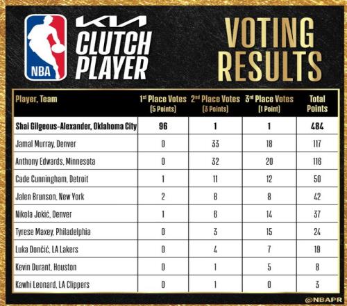 NBA官方也公布了本屆關(guān)鍵之王的投票情況,SGA獲得96張第一選票、1張第二選票、1張第三選票,總得分484分;排在第二的賈馬爾-穆雷只有117分,第三的愛(ài)德華茲116分,第四的坎寧安只有50分;上屆關(guān)鍵之王布倫森今年僅排第五。