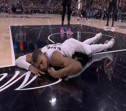 本場(chǎng)比賽第二節(jié),文班亞馬在突破時(shí)失去重心摔倒在地,隨后退出比賽。