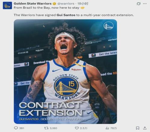 勇士官方宣布:正式跟吉-桑托斯(Gui Santos)完成續(xù)約,雙方簽下多年合同。另據(jù)NBA名記Shams報(bào)道,這份合同是3年1500萬美元。桑托斯原有的合同3年514萬美元,2023年簽約,2026年夏天到期,本賽季薪水222萬美元。