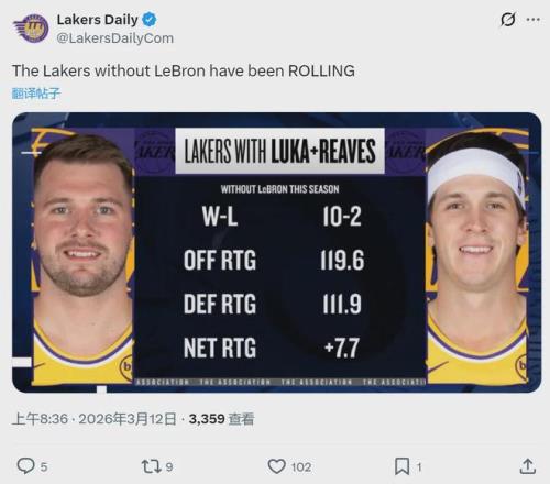 Lakers Daily今天又曬出一組數(shù)據(jù):本賽季當(dāng)詹姆斯缺席,東契奇和里夫斯同時出戰(zhàn),湖人10勝2負(fù),勝率高達(dá)83.3%。這12場比賽,湖人進(jìn)攻效率119.6,高居聯(lián)盟第三;防守效率111.9,聯(lián)盟第六;凈效率+7.7,同樣是聯(lián)盟第三。