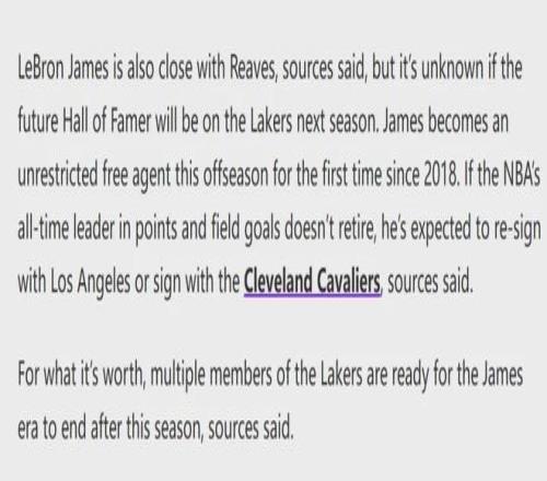 Ashish Mathur在報道中透露,多位湖人球員和管理層已經(jīng)做好準(zhǔn)備,在今年夏天迎接詹姆斯時代的終結(jié)。昨天教主剛剛寫過,今年夏天,里夫斯跳出合同成為自由球員,詹姆斯的合同屆時也將到期,湖人管理層很難同時留下他倆。