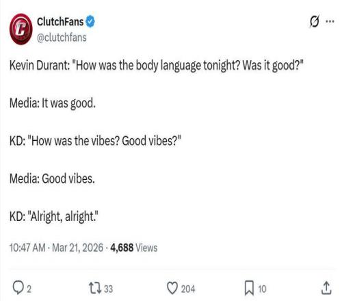 在打出這樣的表現(xiàn),率隊(duì)大勝老鷹終結(jié)對(duì)手11連勝后,杜蘭特賽后面對(duì)記者時(shí)主動(dòng)提問自己本場(chǎng)與隊(duì)友的肢體語言怎么樣?球隊(duì)氛圍好不好?
