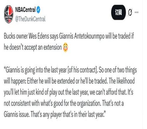 雄鹿老板韋斯-埃登斯接受ESPN采訪時,明確表示下賽季為字母哥的準(zhǔn)合同年(27-28賽季擁有球員選項(xiàng)),球隊(duì)不可能承擔(dān)如此風(fēng)險。