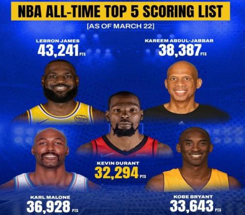 歷史得分榜前四人分別是詹姆斯(43241仍在增加)、賈巴爾(38387)、馬龍(36928)、科比(33643)??票饶壳邦I(lǐng)先杜蘭特1349分,馬龍領(lǐng)先4634分,賈巴爾則領(lǐng)先6093分。