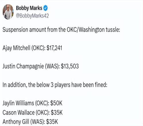 北京時間3月23日,NBA官方發(fā)布公告宣布,由于在周日兩隊的沖突事件中涉事,奇才隊前鋒賈斯汀-尚帕涅和雷霆隊后衛(wèi)阿賈伊-米切爾各被禁賽一場。聯(lián)盟聲明稱,尚帕涅和米切爾因在場上發(fā)生沖突、激化斗毆行為,且沖突蔓延至觀眾席,被處以無薪禁賽。除兩人遭禁賽外,雷霆內(nèi)線球員杰林-威廉姆斯被罰款5萬美元,雷霆后衛(wèi)卡森-華萊士和奇才前鋒安東尼-吉爾各被罰款3.5萬美元。
