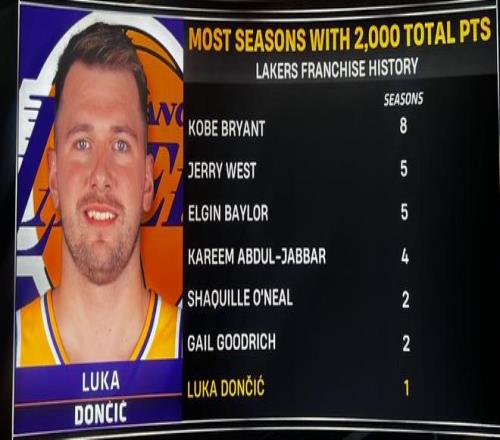 第2、此戰(zhàn)之后,東契奇本賽季總得分為2005分,是湖人隊(duì)史第七位單賽季得分突破2000的球員。前六位分別是:科比布萊恩特(8次)、杰里·韋斯特(5次)、埃爾金·貝勒(5次)、賈巴爾(4次)、奧尼爾(2次)、古德里奇(2次)。