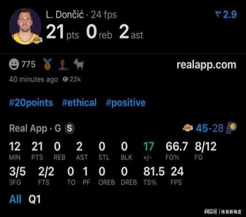 比賽開場(chǎng)第一節(jié),東契奇就展現(xiàn)出了驚人的得分爆發(fā)力。他12次出手命中8球,其中三分球5投3中,一人獨(dú)得21分,還送出2次助攻。當(dāng)時(shí)我興奮得差點(diǎn)跳并不高超的算術(shù)水平,也能輕易算出,如果按照這樣的節(jié)奏,四節(jié)比賽打完,東契奇豈不是要狂砍84分?84分啊,這個(gè)數(shù)字一旦達(dá)成,將剛好超越阿德巴約之前創(chuàng)下的83分紀(jì)錄。