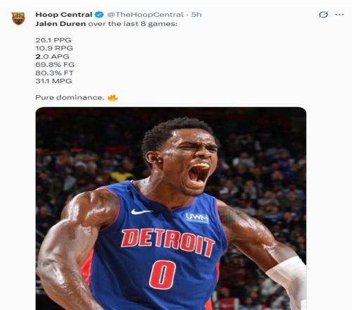 坎寧安因為氣胸缺席的這6場比賽,杜倫場均30.7分鐘,拿到26.5分10.1籃板2.7助攻0.8搶斷0.8蓋帽,命中率67.5%,他明顯成為了活塞的第一箭頭。