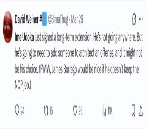 火箭記者大衛(wèi)-韋納:火箭隊(duì)剛剛跟烏度卡續(xù)約了長(zhǎng)約,火箭不會(huì)解雇他。但火箭隊(duì)的確需要人來(lái)幫助烏度卡設(shè)計(jì)進(jìn)攻戰(zhàn)術(shù),這個(gè)人肯定不能是烏度卡,如果鵜鶘解雇了博雷戈,那么博雷戈是一個(gè)不錯(cuò)的人選。