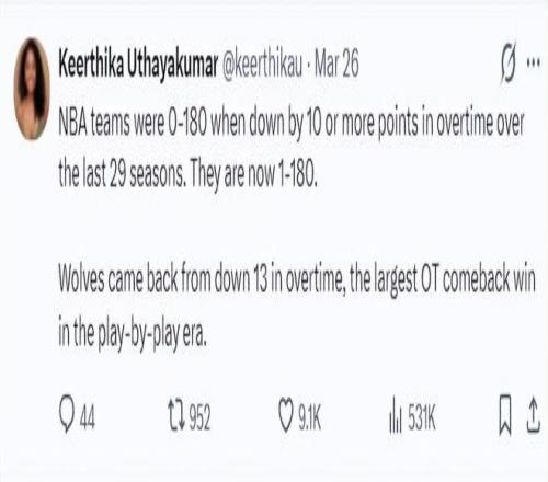 根據(jù)森林狼記者的統(tǒng)計(jì),在過(guò)去29個(gè)賽季,加時(shí)賽中落后10分或更多時(shí),NBA球隊(duì)的戰(zhàn)績(jī)是0勝180負(fù),如今森林狼以一波15-0逆轉(zhuǎn),他們成為過(guò)去29個(gè)賽季首支完成超級(jí)逆轉(zhuǎn)的球隊(duì),火箭被釘上恥辱柱。