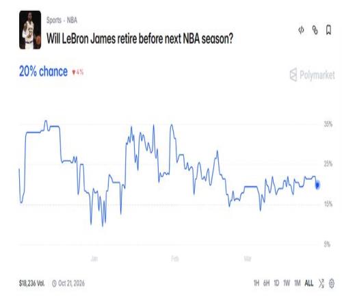 根據(jù)數(shù)據(jù)媒體Polymarket的預(yù)測,詹姆斯在本賽季打完后退役的概率只有20%。就算洛杉磯湖人隊(duì)最終放棄了老詹,那么聯(lián)盟其余的29隊(duì)可能都會(huì)來爭取他。如果勒布朗愿意接受底薪的話,不知道多少球隊(duì)要踏破勒布朗的門檻。